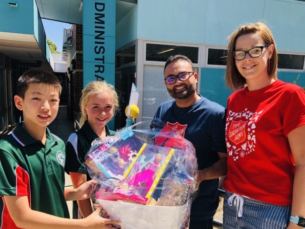 At the end of the collection period, the Salvos send two representatives to visit our school and speak at our assembly. This year Jo and Yonni visited us and Jo explained to the community just what happens at the other end of the collection. She explained how they place all the toys out so it looks like Kmart and pack all the food into bags. Then over 400 families come through the Corps at Balga and are handed a bag of Christmas food and the parents can walk around with a trolley and choose a toy for every child in their family. The Salvos make the experience feel like a normal shopping experience to give people more respect and dignity when they come in. They are offered coffee and child care so all the toys are a surprise for the children. After Jo and Yonni shared with the school, our Head Boy and Head Girl presented our last donations to them.